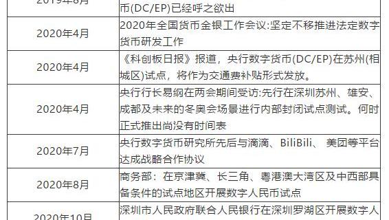 2014年,中國人民銀行成立法定數字貨幣研究小組,論證發行法定數字貨幣的可行性,經過六年的分析論證、技術研究、風險規范等,于2020年4月,在深圳、蘇州、雄安新區、成都及未來的冬奧場景進行內部封閉試點測試。