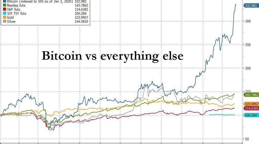 但絕對引人注目的是,盡管比特幣產生了如此巨大的回報,但市值變化卻相當小。如下圖所示:債券市值今年以來增加了13.1萬億美元,股票市值增加了11萬億美元,而比特幣卻在市值僅增長3000億美元的情況下創下了驚人的表現,升至24000美元的歷史高點。相比之下,價格表現較比特幣遜色得多的黃金,今年以來市值也增加了5000億美元。