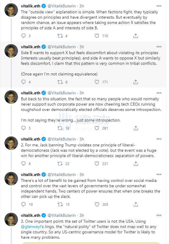 2021 年 1 月 12 日,V 神打破了自己一以貫之的「Twitter-minimization」原則,在推特上發表對此事的觀點。他表示,Twitter 創始人杰克·多西?(Jack Dorsey) 禁止美國總統的行為違反了自由、民主的原則(多西并非票選出來的),但同時,這也是權力分立的勝利。