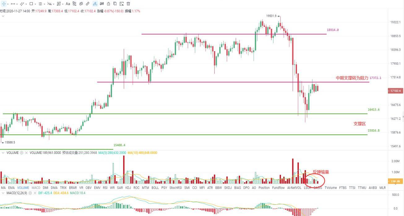 目前的客觀走勢及應對策略:之前一直強調的偏中期關鍵支撐位17370在跌破后遲遲不能再次站上,而且反彈后兩次在該價位附近出現受阻跡象,說明該支撐位已經轉換角色變為阻力,目前幣價的反彈正在受制于該阻力。