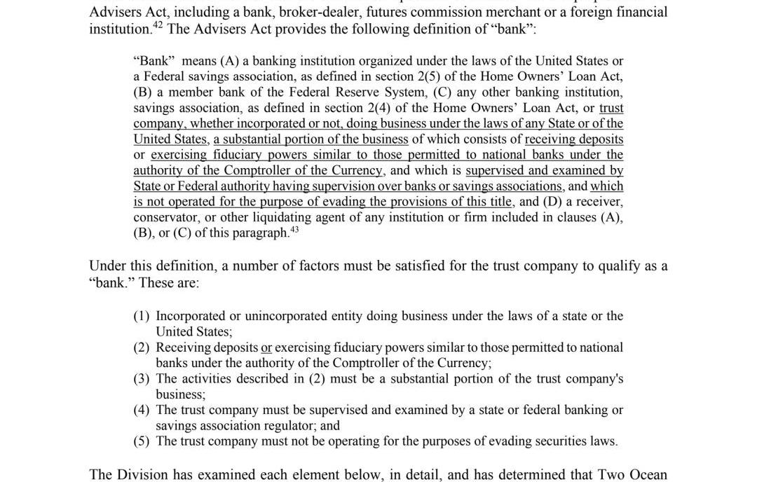 這封信指出,TwoOcean雖然是一家資管機構,但是他滿足《1940顧問法》對“銀行”的定義,而銀行已被許可經營數字資產的托管業務,可以在《SEC托管規則》下成為“合格的托管人”。所以這才造就了TwoOcean的合規性,這是第一家資管公司成為合規托管人。
