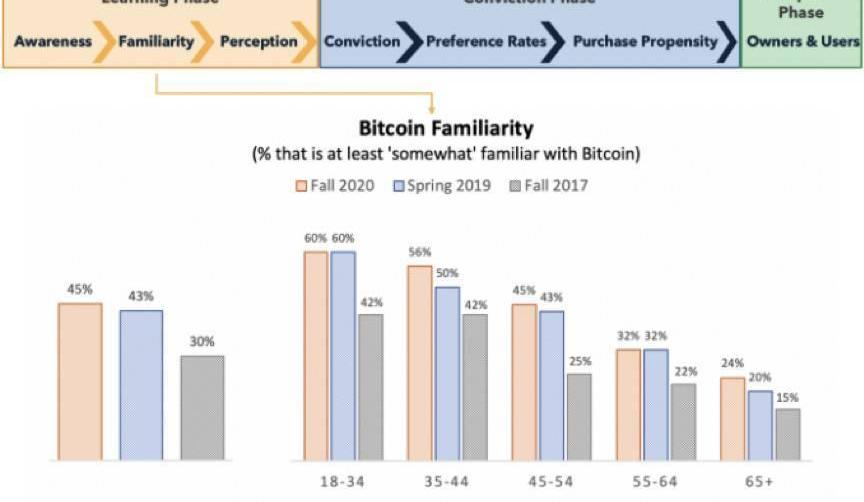 與「認知」指標相似,我們觀察到一般人群對比特幣的「熟悉」程度有所增長,但整體趨勢呈現平穩樁體——對比特幣「至少有點熟悉」的人,比例從2019年春季的43%上升至2020年秋季的45%。在2020年這次最新調查中,這項指標存在一定年齡偏向,其中: