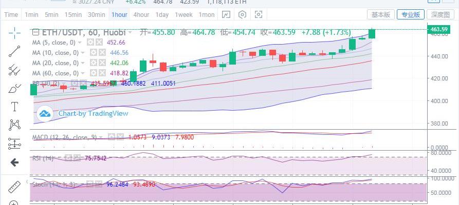 以太坊已出現3連陽,尤其是近兩日,更是領漲主流幣,漲勢喜人,波幅達30-40余點。今日開盤以來,450壓制位失守后,現已強勢上沖至464一線,目前日線布林帶上軌已被強勢企穩,大有直奔周線布林帶上軌而去的意思。今日上方壓制位關注周線布林帶上軌476-477附近,下方支撐先關注四小時布林帶上軌454-453位置,其次是450位置。