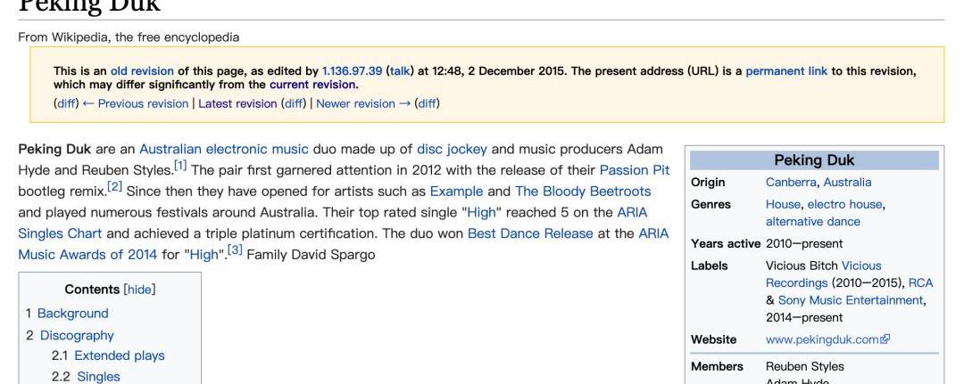 DavidSpargo修改了PekingDuk的維基百科詞條,在「家庭成員」加上了自己的名字,名場面:https://en.wikipedia.org/w/index.php?title=Peking_Duk&oldid=693419023