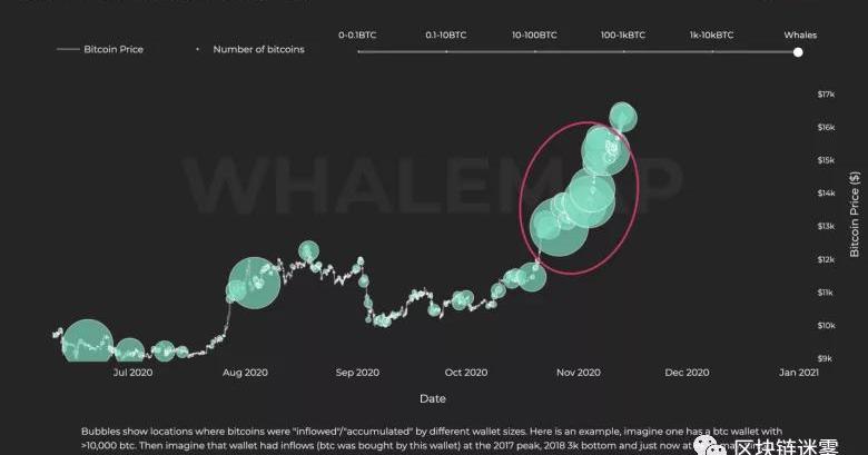 所附圖表著重顯示了巨鯨錢包在不同價位的流入量。