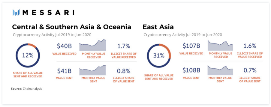 此外,根據 Chainalysis 的數據,從 2019 年 6 月到 2020 年 6 月間,42% 的加密貨幣活動都發生在亞洲地區,交易額 2960 億美元 (見下文)。