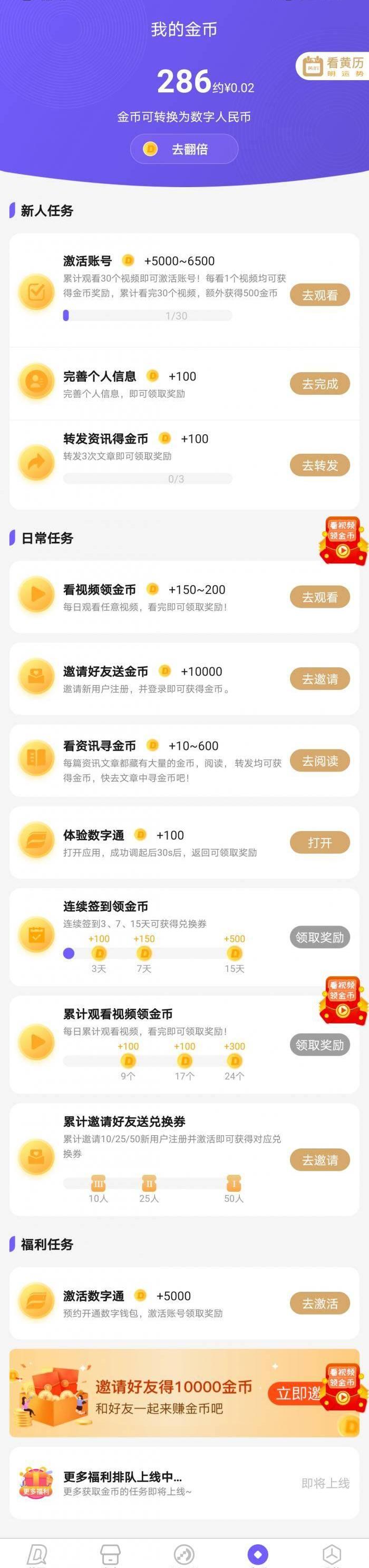 實際下載完成打開D訊,彈出是否允許訪問設備的照片、媒體內容和文件,被拒絕后APP無法打開使用。這款APP更像是一個集資訊和視頻為一體的廣告推銷軟件。頁面顯示通過完善個人信息、轉發資訊、看視頻、邀請好友等任務可以獲得金幣,而金幣可以轉換為數字人民幣。記者點開視頻任務,觀看了一快手的下載廣告后,獲得了186金幣,約為0.01數字人民幣。至于它推廣中所提及的預約數字人民幣,需要下載另一款“數字通”APP,而實際上也是與D訊類似的做任務領獎勵的廣告軟件。