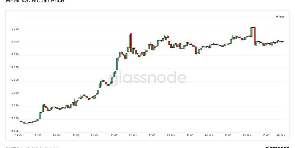 比特幣在第43周出現了一些令人印象振奮的漲幅,超過了13000美元,并持續保持在這一價位直至本周。其鏈上基本面依然強勁,似乎偏離了傳統金融市場的趨勢。