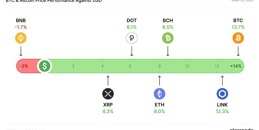 表現最好的前十名山寨幣是LINK,相對于BTC僅下跌1.2%。同時,BNB在比特幣相對下跌了13.6%,是過去一周唯一一個美元價值也下跌的主流山寨幣。