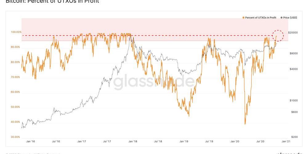 隨著比特幣最近漲到13000多美元,UTXO的盈利部分目前達到98%,這是自2017年12月以來從未達到過的數值。這種高價值,通常在BTC牛市運行期間出現,這意味著幾乎所有的UTXO都是在價格比目前低的時候創造的。