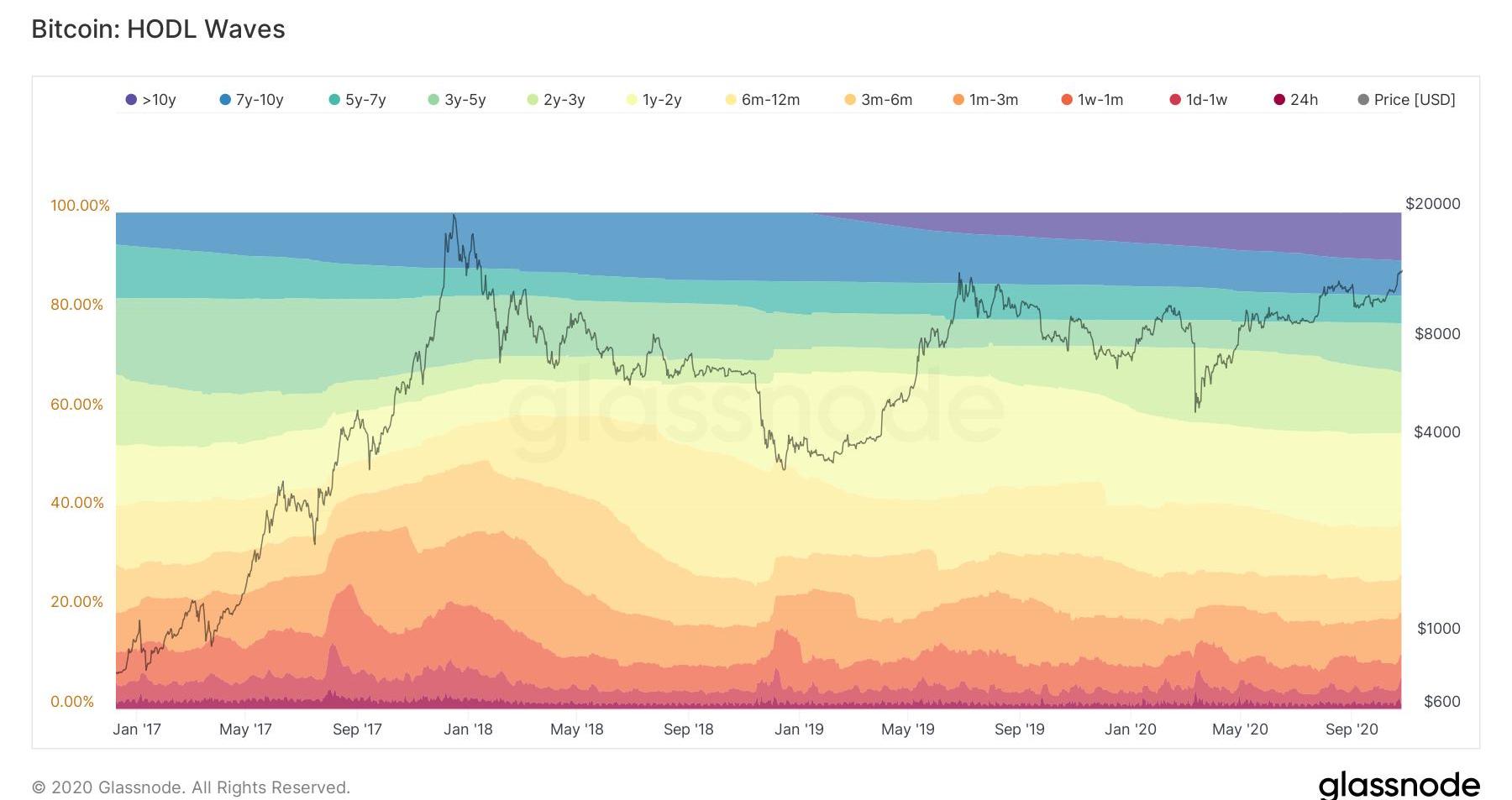 我們還可以觀察到“囤幣”模式的增加——在一段時間內一直沒有改變過地址的比特幣供應百分比。62%的供應量至少在一年內沒有改變過地址,而近三分之一的供應量在三年或更長時間內未改變過地址。
