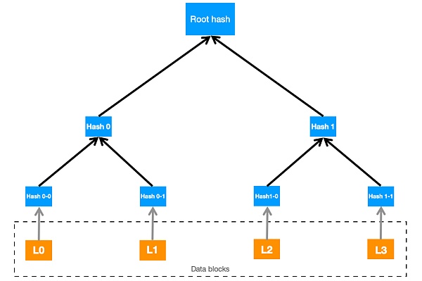 梅克爾樹又被稱作哈希樹,因為在這種樹狀數據結構中,每個節點的標簽(或稱作值)都是一串哈希值。按照從左向右的順序,將所有子節點的哈希串聯成一個新的長字符串,結果作為哈希函數的輸入,經計算得到父節點的標簽。