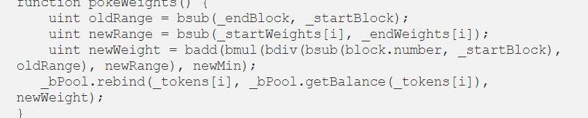 在上面的線性例子中,團隊將其項目token的權重設置為80%,DAI的權重設置為20%。在6個月的時間里,權重會逐漸調整并最終二者翻轉過來。線性公式已在controller合約中有明確描述,并允許任何人對合同進行poke以更新權重。每次權重變化時出現的小套利機會會引來更多的交易者。以下是pokeWeights代碼中的函數,該函數允許任何人調用并執行一系列的變化,從區塊號到權重大小。