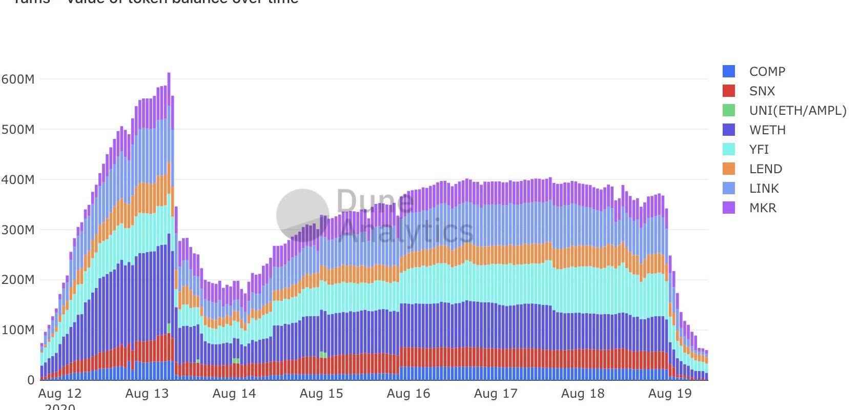 YAM是繼yfi之后第二個引爆farming市場的產品,最高時有6億多美金鎖倉量。出現難以修復的bug后YAM代幣價格暴跌,從100多美金最低跌至0.4美金,不過bug并沒有傷其根本,后續鎖倉量仍然維持在3-4億美金之間。