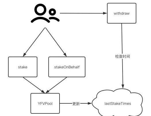 回到用戶抵押的邏輯,可以發現抵押邏輯中的stakeOnBehalf函數本意是幫助進行抵押,但是這里有個問題,如果這個用戶先前已經有抵押了呢?那通過對已經抵押的用戶再次進行抵押,比方說抵押1個YFV,是不是就能以極低的成本重置已抵押的用戶的計時器,導致用戶在withdraw時無法成功調用。更進一步,假設YFV抵押用戶已經成功調用了stakeReward函數,在快要達到unfrozenStakeTime所規定的時間時,惡意的用戶可以通過stakeOnBehalf函數給這個用戶抵押少量資產,即可再次對抵押獎勵進行鎖定,理論上這樣往復循環,即可使用戶無法取出自己的資產,但這個問題并不會導致資金損失。攻擊流程如下:
