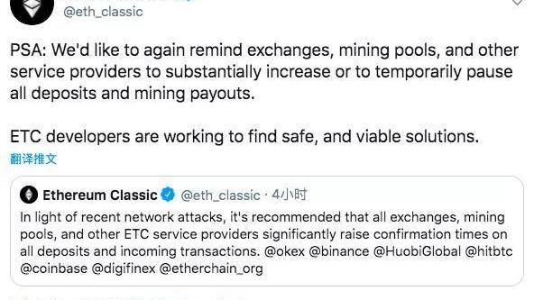 同日,ETC官方確認了攻擊并承諾正在努力解決該問題。“盡管ETC在評估建議的解決方案方面取得了進展,但我們意識到在這些低哈希率水平下,網絡當前面臨的風險。對于礦工、交易所和其他服務提供商,我們建議暫時將確認要求水平保持在7K以上。”