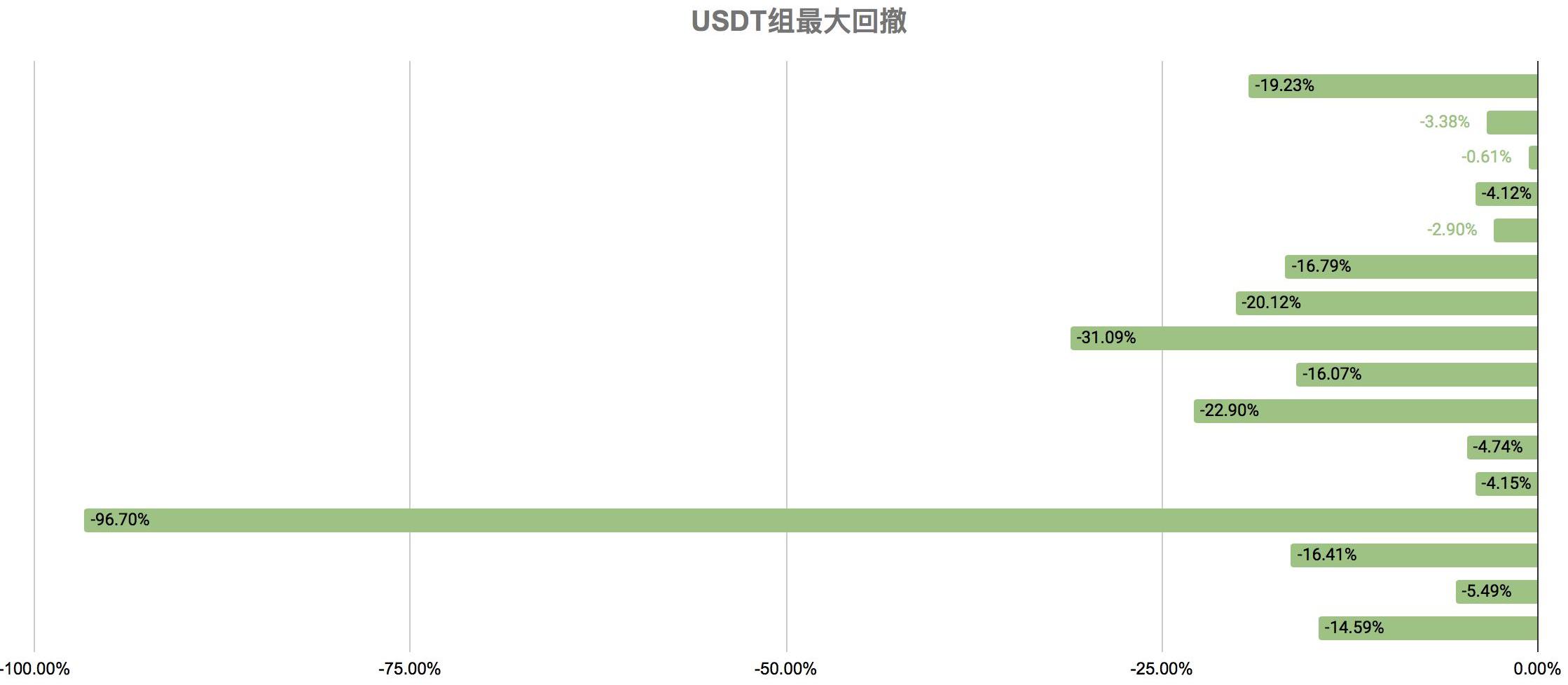 根據最大回撤數據顯示,個別量化受杠桿影響加之行情波動幅度較大,整體處于爆倉邊緣。