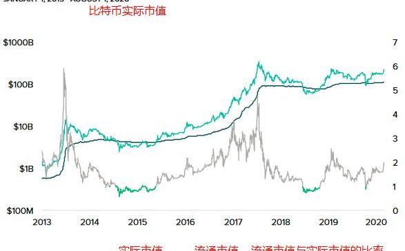 比特幣的實際市值,是通過計算每個比特幣在最后一次鏈上移動時的價格計算得到的。例如,在計算比特幣實際市值時,2012年轉移的比特幣對總市值的貢獻要小得多,因為當時比特幣很便宜。使用這種方法衡量比特幣總市值時,分析師就可以忽略掉那些因私鑰丟失而永遠找不回來的比特幣。