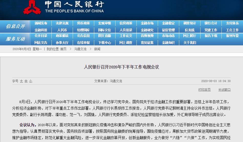8月3日,央行召開2020年下半年工作電視會議,總結上半年各項工作,分析經濟金融形勢,對下半年重點工作作出部署。央行行長易綱作工作報告,央行黨委書記郭樹清主持會議并作總結。副行長陳雨露、潘功勝、范一飛、劉國強,派駐紀檢監察組組長徐加愛等出席會議。