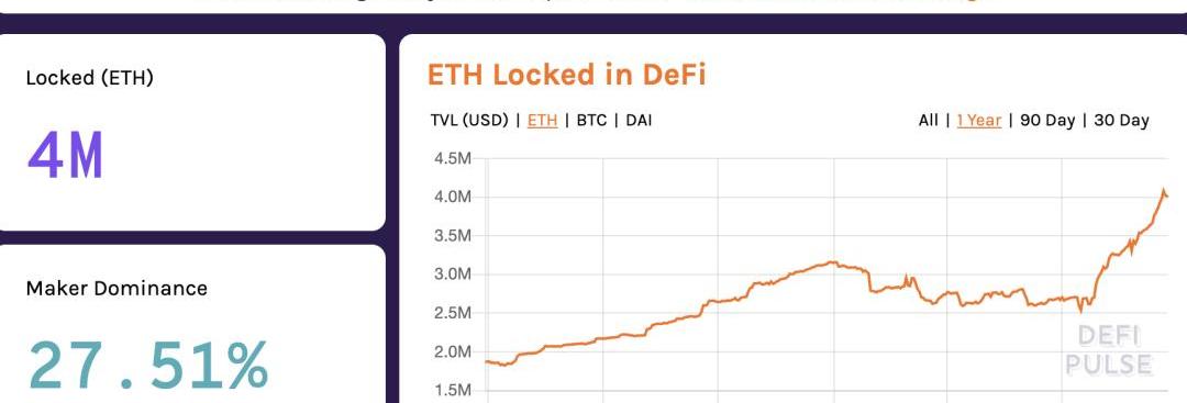 ETH是用戶進入DeFi的入場券,YieldFarming熱潮刺激了市場對ETH的需求激增,才使得ETH在醞釀了一個多月之久后爆發。Defipulse數據顯示,過去一個月整個DeFi鏈上鎖定ETH數量激增,從261.8萬上漲至400萬個,漲幅達到72%,創下歷史新高。