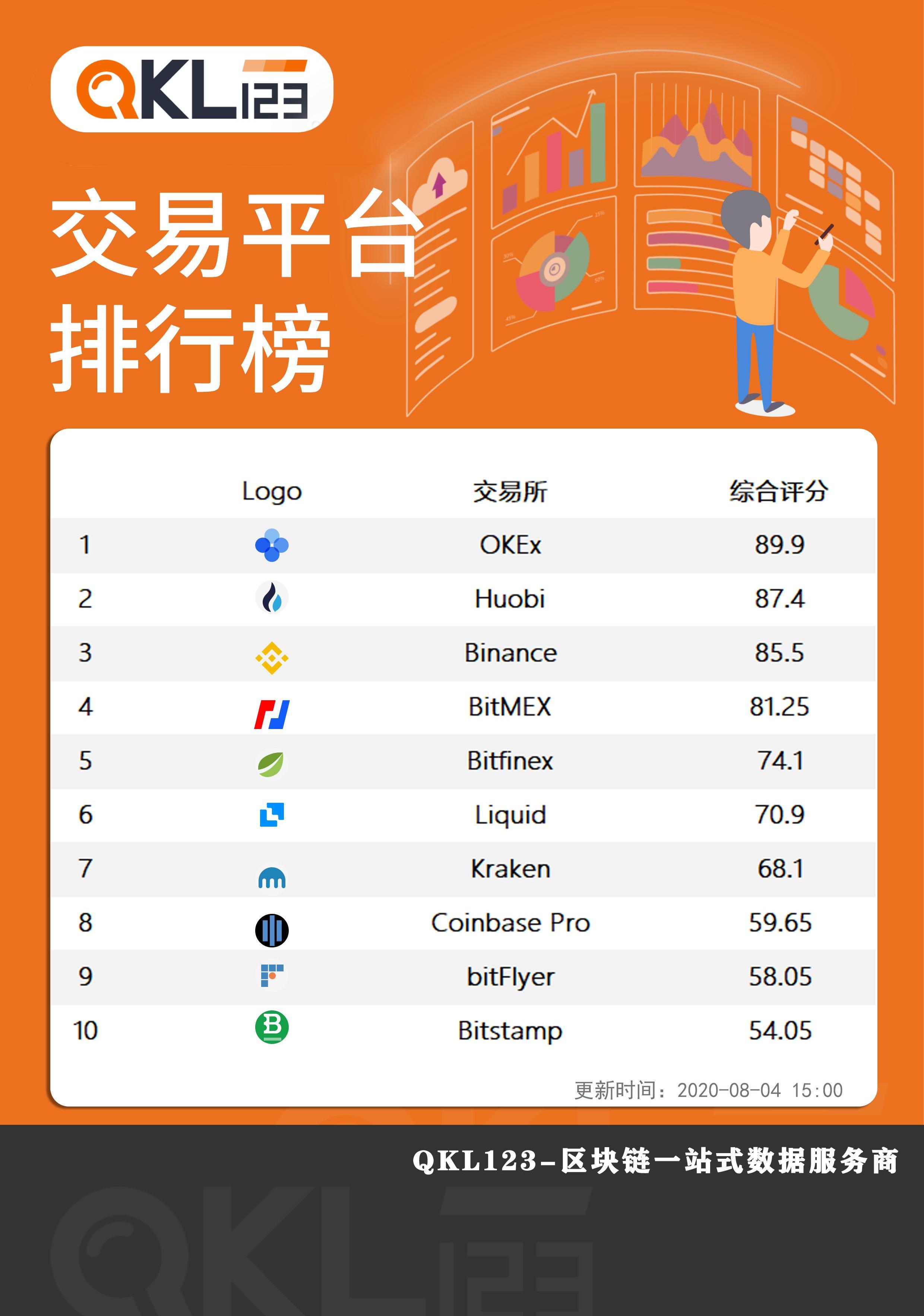 區塊鏈交易平臺排行以QKL123綜合評分作為唯一依據,對QKL123收錄的390+交易平臺進行排名。月度榜單前十的交易平臺分別為OKEx、Huobi、Binance、BitMEX、Bitfinex、Liquid、Kraken、CoinbasePro、bitFlyer和Bitstamp。其中綜合評分80分以上的交易所有4個,分別是OKEx、Huobi、Binance、BitMEX。