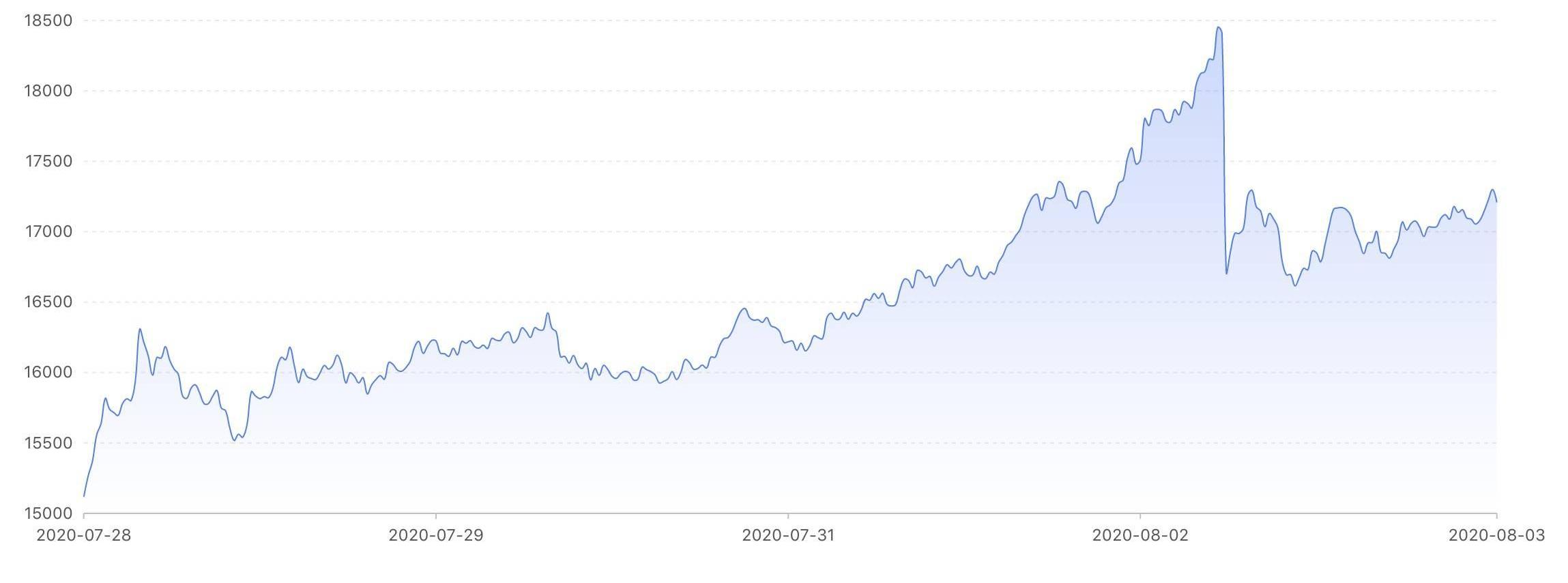 8月2日,巴比特綜合指數上升到最高值18450.96點,隨后閃崩至16711.21點,目前則反彈至17208.15點。