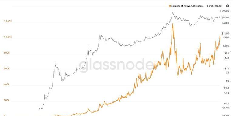 平均每天100萬的活躍地址的里程碑是在2017年底比特幣價格飆升至2萬美元之后的幾個月里出現的。當時,主流媒體對這筆資產基本不予理睬,但它似乎已經東山再起。