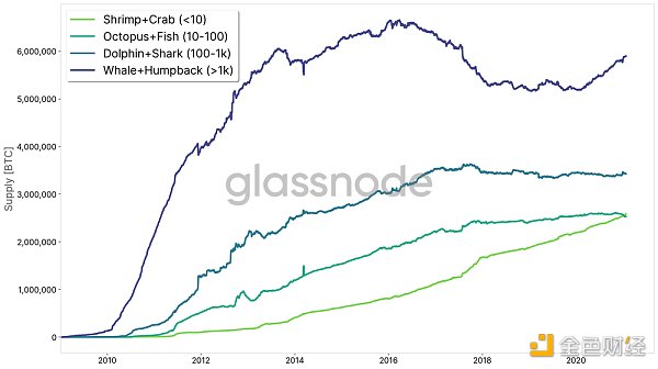 我們根據網絡實體的比特幣持有量將其劃分為以下海洋物種:
