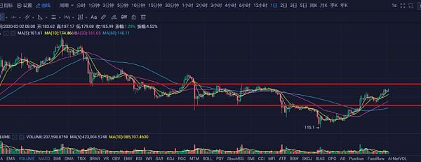 ETH:從日線上看,目前價格已經到達了19年8-9月份的震蕩區間的高位,即155-200美元運行區間,下方均線依次并行成多頭排列,鑒于即將到達重要壓力位,日線存在回調的壓力,需要儲備更強大的能量,例如先拉近與30日均線的距離,欲進一步上行需打破近幾日的價格雖漲但量能卻逐步回縮的尷尬態勢。