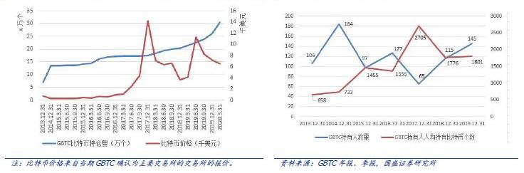 GBTC2013年開始募資,當年年底持有比特幣69735個,2019年底,GBTC持有261192個,CAGR高達25%,2020Q1超過了30萬個。盡管比特幣在2013~2020年間波動較大,但GBTC持倉量穩步上升。而GBTC份額的持有人數與人均持有比特幣的個數波動較大。