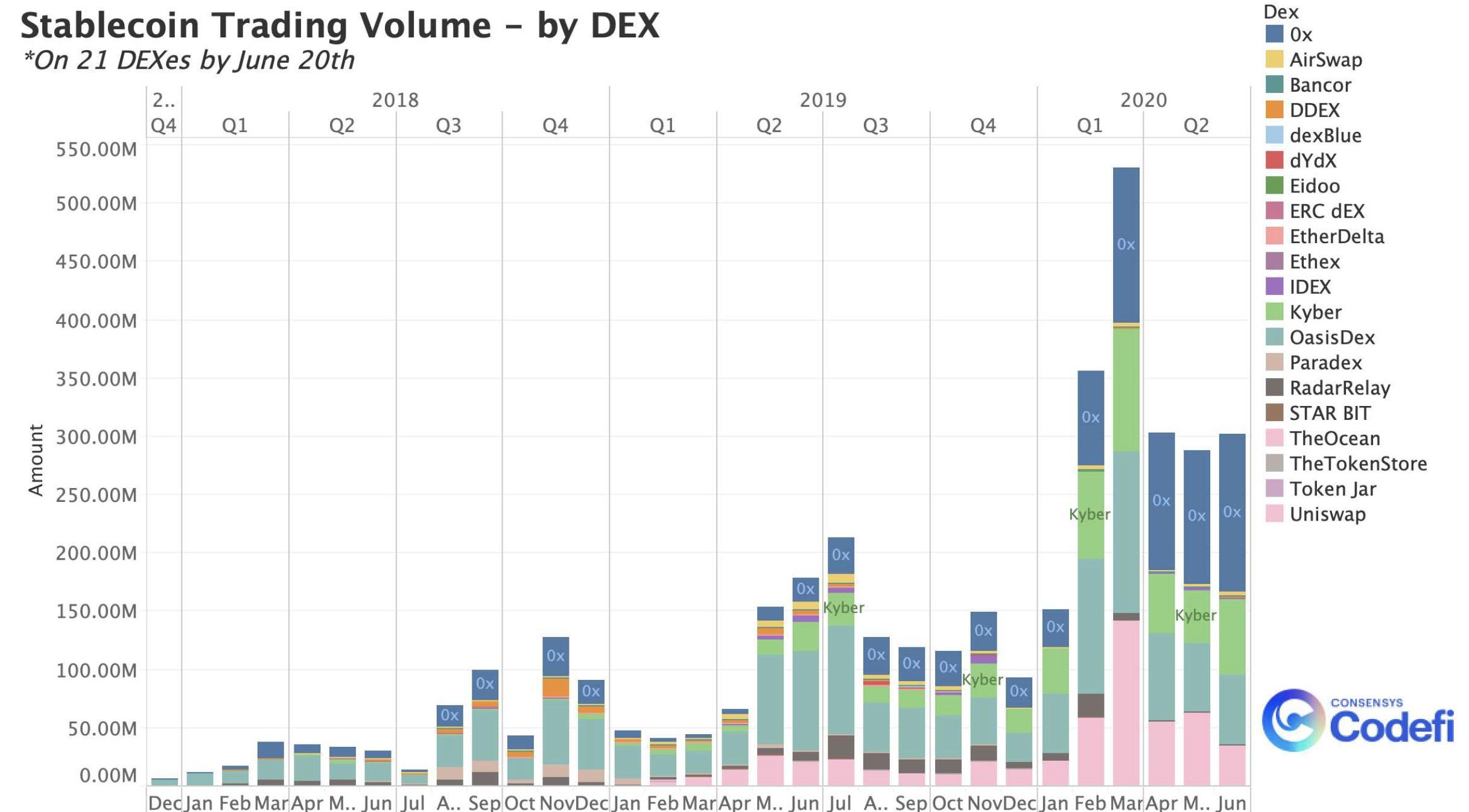 DEX上的穩定幣交易量幾乎全部由四個協議捕獲:Uniswap,OasisDEX,Kyber和0x。在第一季度末時,Uniswap當時看似可能會繼續在穩定幣交易量中占越來越大的百分比,并且到本季度末,交易量在四個DEX之間平均分配。然而,在第二季度,Uniswap占穩定幣整體交易量的百分比開始降低,并且已經恢復到與2019年相當的百分比。