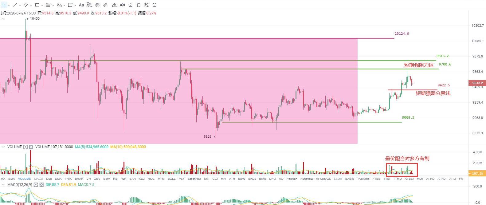 對于未來兩天的行情我是這樣看的,市場的做多情緒剛剛被激發出來,短期不易結束,而且從現在幣價的表現也可以看出雖有回落,但出于可控狀態。所謂可控是指幣價已經在9420這一關鍵支撐上方出現止跌企穩現象,于此同時這幾天的量價配合也比較健康,呈現出價漲放量,價跌縮量的狀態。