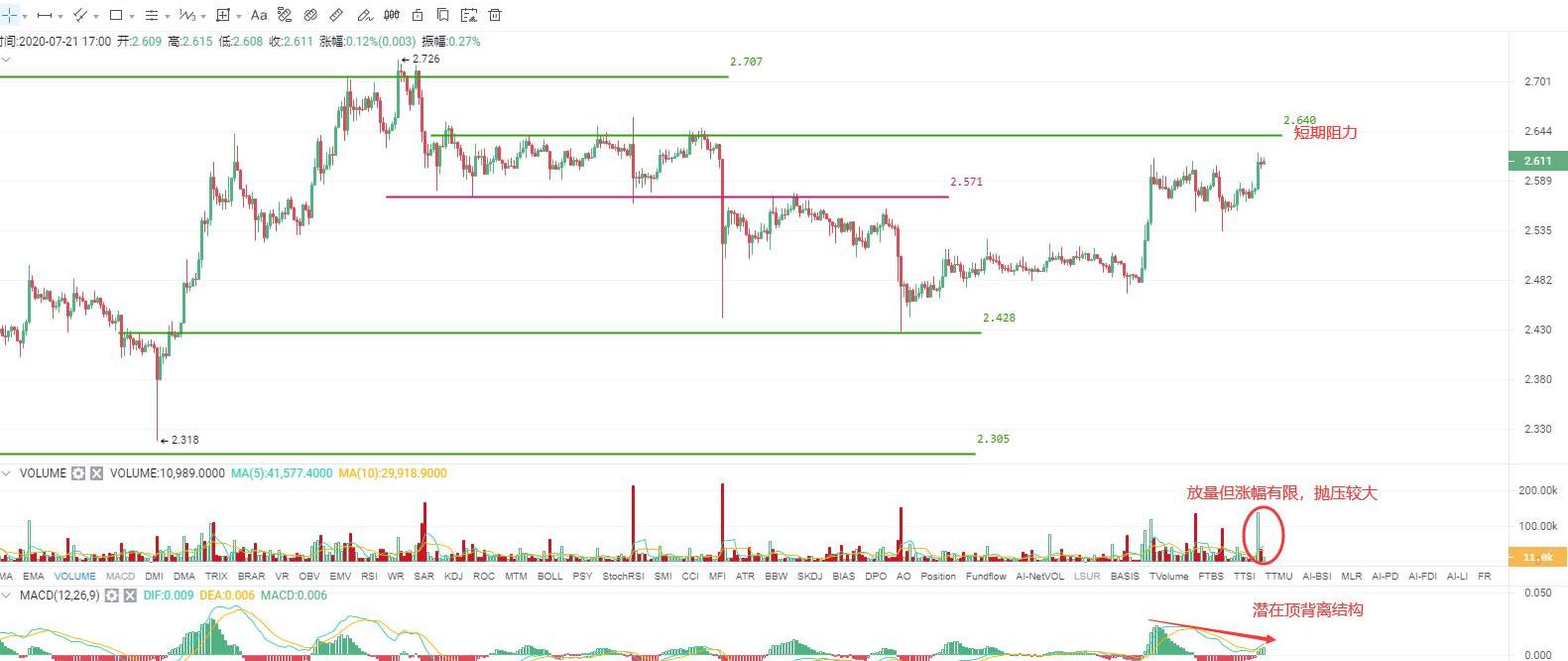從目前的走勢看,短線反彈結構延續的概率較大,不過在MACD指標上開始出現一絲絲頂背離跡象,再加之成交量明顯放大后漲幅有限,說明上方的拋壓盤較多。如此來看,建議也不呀對后續的反彈延續空間抱有過高預期,需要重點留意2.64-2.70區域阻力,若進入該區域容易再次引發價格短期頂部形成,可關注這種潛在短線交易機會。注意,現在所看到的都是偏短線的機會,不要過分“加戲”。