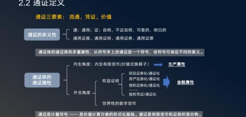 這里講通證的定義,通證的定義可以簡單理解為流通、憑證、價值,因為通證具有多義性,從符號學講是有很多的,這個“通證”代表很多的意義。在通證體里面,通證的書名基本上從兩個角度,內生角度和外生角度,內生角度是有限貨幣,在通證經濟體里面的貨幣跟我們現實的貨幣不是一個概念,雖然它都是一個符號,但是符號的內涵是不一樣的,我定義為有限貨幣是價值交換的算子,它有生產屬性,比如Filecoin里面,礦工跟用戶之間用Filecoin來交易,是有經濟邏輯的。簡單來說通證是計量符號,是價值計算方案的形式化基礎。通證是有現貨幣和證券的混合物,這是我的定義。