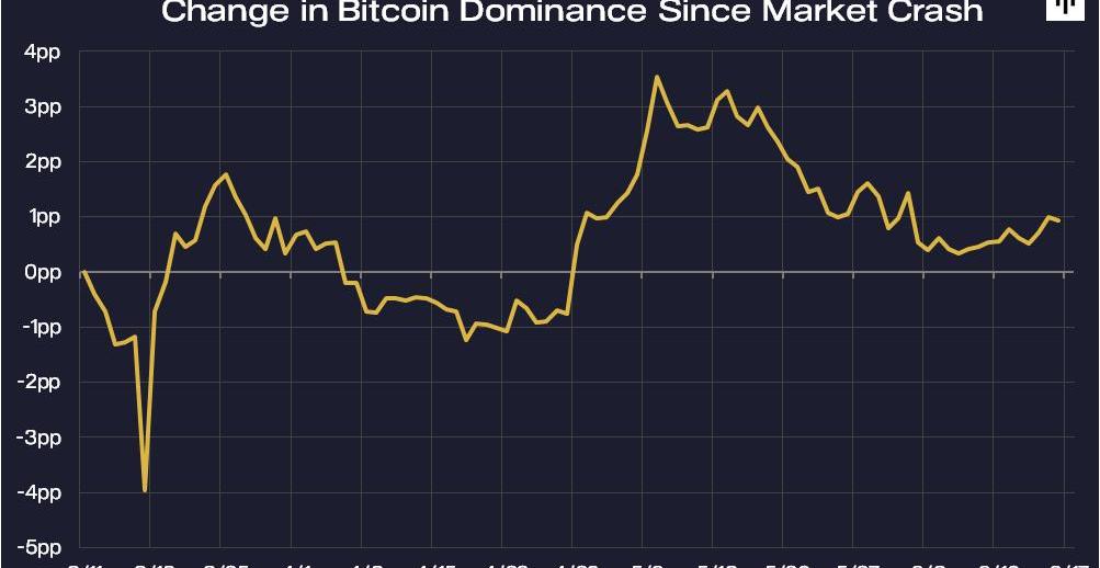 “比特幣的主導地位”——比特幣在整個加密貨幣市場的份額——在3月中旬為64.60%。該指數在5月19日達到最高點68.73%,現在回升到64.6%。我們預計它會下降,因為其他加密貨幣開始表現出色——如上所述。