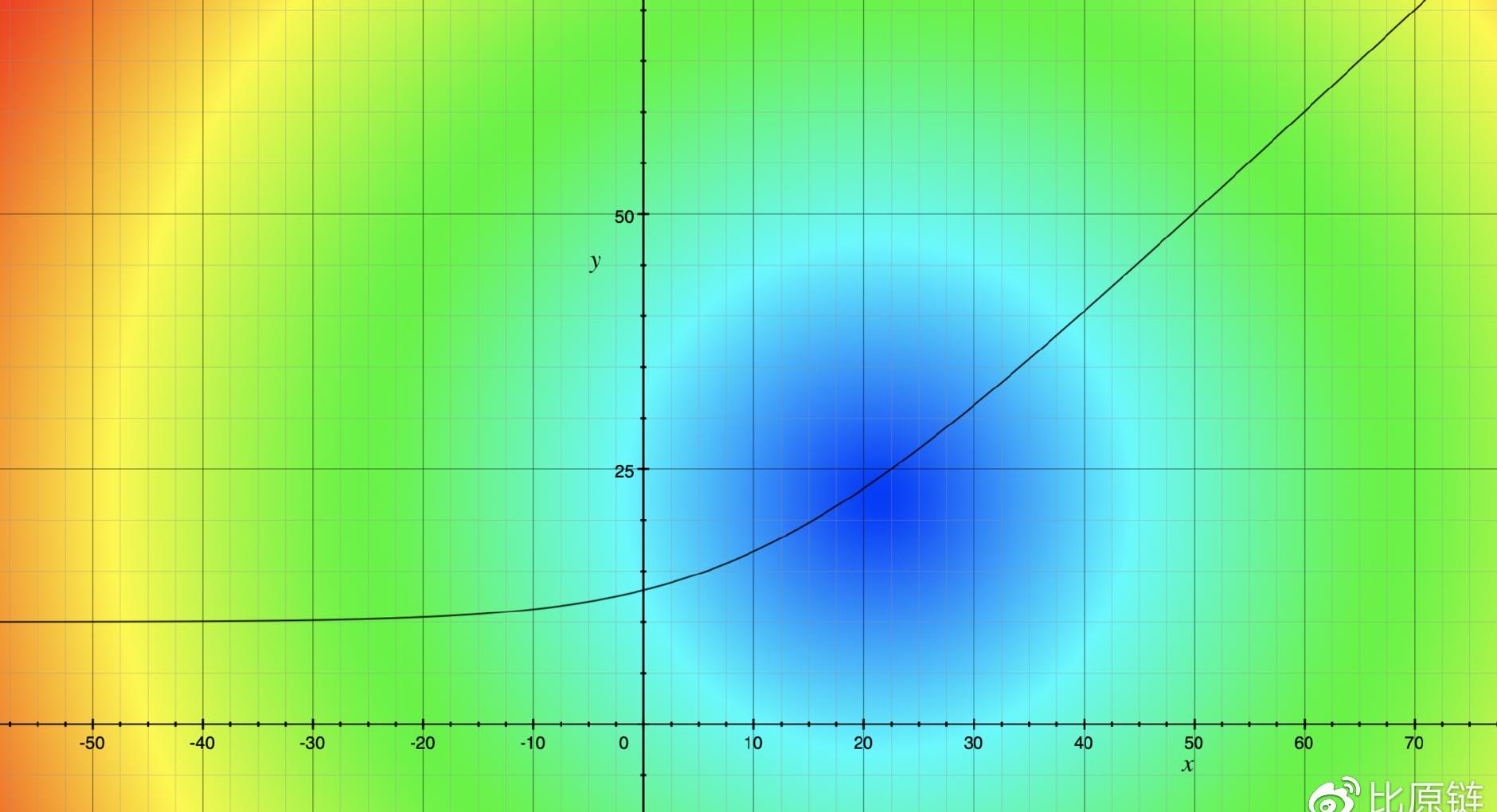 能否將兩個函數各自的優勢結合到一種新函數中——穩定的匯率輸出、極低的交易滑點、可自動調節的場內匯率以及無盡的流動性保護。從圖像直覺上,我們其實在尋找一條在兩條曲線之間的一種曲線,既能夠在中間位置貼近直線,又能夠在尾端向雙曲線一樣無限貼近坐標軸。在幾何數學上,要獲得兩曲線之間的線只需要將二者的表達式相加:
