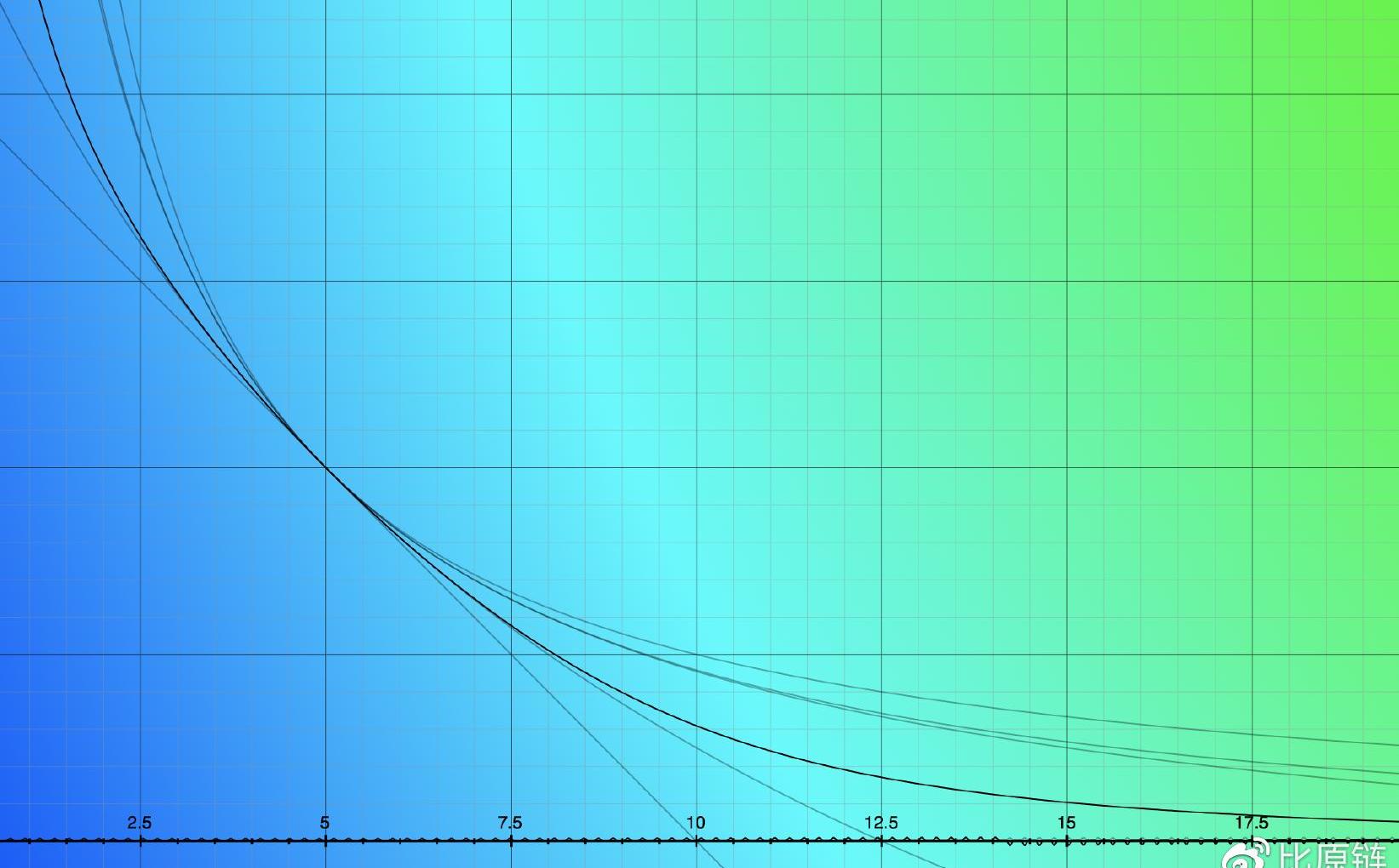 雙曲線最為直觀得反應了供求與價格的關系。其函數曲線無限接近與x和y軸,但永不相交,即當一方代幣因為極度需求導致池中數量越來越少,則其價格接近無窮大,兩幣數量比即為匯率,也即雙曲線對應點斜率。這條曲線完美解決了上述兩個難題,但同時又引入了一個新的致命問題:無法適應穩定幣兌換場景。穩定幣大多數情況下匯率是穩定的,而且接近1:1,雙曲線函數會引入很大的滑點,即便在很少的交易量下,因此不利于滿足大額穩定幣兌換的需求。
