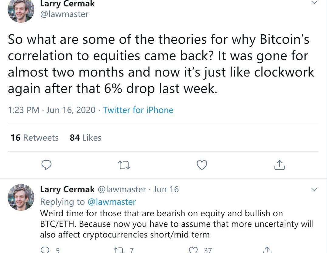 LarryCermak發推表示比特幣與股票的相關性回歸
