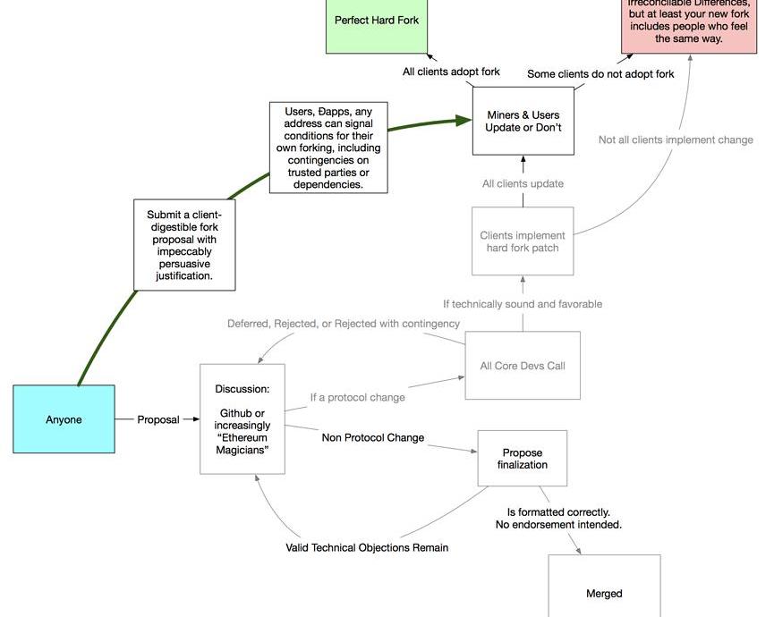 核心開發者的到底使用什么流程來產生決策?嗯,有點像EIP流程的“實時”版本,只不過是每兩周作一次實時討論。我的意思是,IETF風格、粗糙的共識和可運行的代碼,才是這個過程的核心。最近的討論指明需要增加一些形式——要求共識和記錄討論——也許是為了消除不確定性。