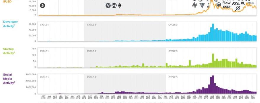 第三個周期在2017年達到了頂峰,此時意味著數字貨幣更廣泛的影響吸引了社會上的主要關注。這一輪周期再次將該領域的開發者和初創公司的數量又增加了大約10倍。數字貨幣領域從邊緣地帶走向了真正意義上的初創領域。