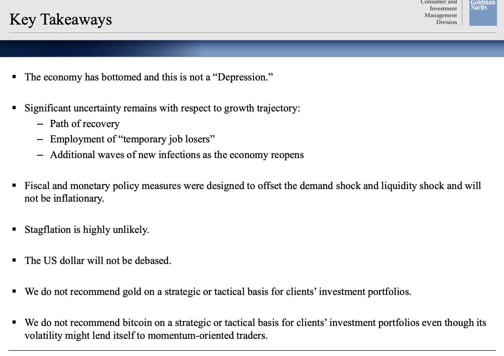 XRP/HKD-7.1%5月27日,投資銀行巨頭高盛舉行主題為《美國經濟預期與當前通脹、黃金,以及比特幣的影響》的電話會議。目前有關這次會議的幻燈片已經在網上公布。本文摘錄編譯了其中關于比特幣的部分。高盛認為,比特幣不產生現金流;在全球經濟增長中不產生收益;也沒有持續的多元化效益;價格極度不穩定;同時也沒有證據表明比特幣可以對沖通脹。此外,這家投資銀行巨頭還表示,包括比特幣在內的加密貨幣并非一種資產類別。