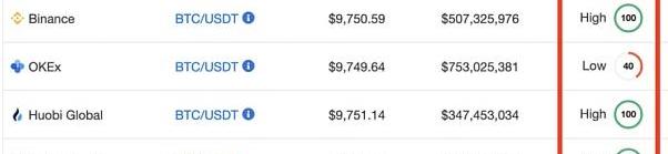 這就是因為在交易量指標當中存在置信度因素,CMC對OKEx的交易量置信度評分很低,說明它認為OKEx存在大量刷量的行為,此舉會影響交易量和流動性兩個指標的真實性,所以權重大幅度降低。