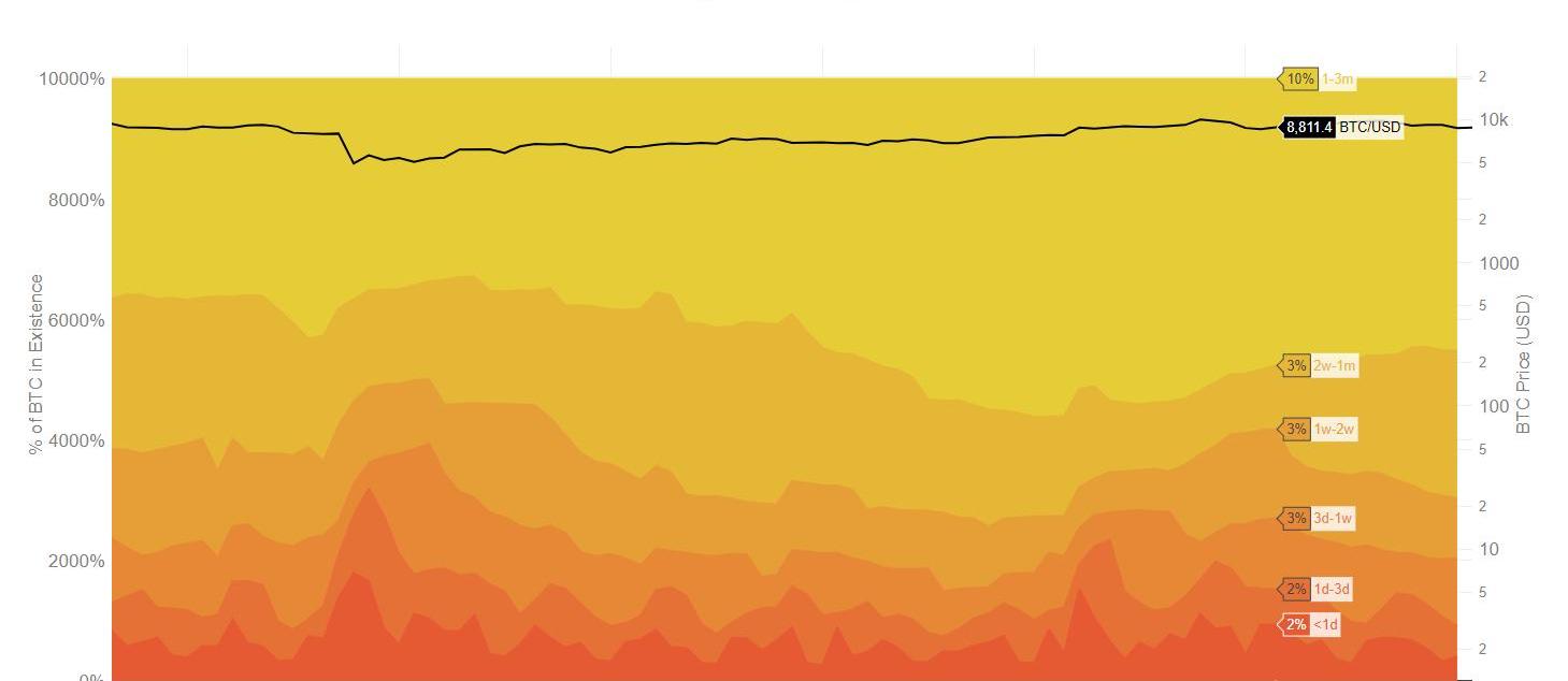 比特幣UTXO在鏈上交易時都有對應的時間戳,使得所有比特幣都有一個對應的未交易時長。在0312大跌之后,受市場抄底情緒影響,大量年齡低于一天的UTXO產生。同樣的情形也出現在0430放量大漲之時,只是前者更為明顯。近期,年齡低于一個月的UTXO,整體呈現先降后升,且在0512減半后繼續回升。