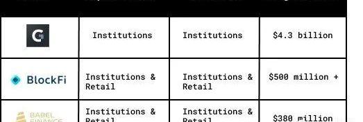 加密行業增長最快的部分之一是信貸市場,尤其是在機構和散戶貸款人的推動下。這些公司通過向存款人保證利率來聚集資本,然后將其借給機構投資者或散戶。其中最大的公司包括GenesisCapital、BlockFi以及BabelFinance。這些貸方之間的主要區別在于,有哪些類型的投資者構成了其存款基礎,是機構還是散戶。