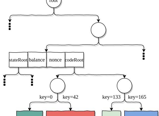 出于效率考量,我們合并相鄰塊,直到每個代碼塊都至少有128字節為止。接著以第一個字節作為key,將這些合并后的代碼塊插進Trie。最后,客戶端將此Trie的根作為該合約賬戶的新記錄存儲下來。如下圖所示,記錄代碼的Trie會成為狀態樹的子樹。