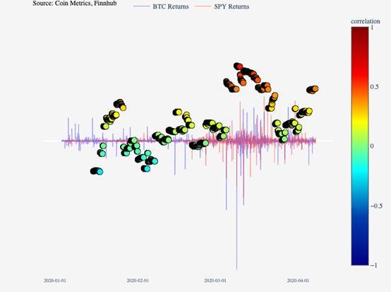 日內價數據顯示,BTC與股票市場的相關性在黑色星期四達到了峰值,當時數字貨幣市場和股票市場都經歷了歷史性的暴跌。隨后相關性在3月底前降回相對正常的水平。但此后它又開始攀升。