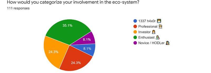 當受訪者被問及,如何對他們在生態系統中的參與進行分類時,67.5%?的參與者將自己歸類為「雖然知識淵博但并不特別注重技術」,具體分布為:愛好者、投資者以及新手中;剩下的?32.5%?的人將自己歸類為「在生態系統中工作的專業人士或開發者」。