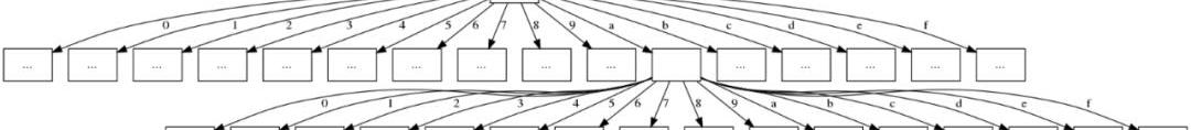 目前,以太坊的狀態樹是十六叉制的。十六叉制表示每個節點有16個孩子節點。理論上講,這種方式挺好的,因為孩子節點多意味著只需要更少的“層”便可存儲所有數據。