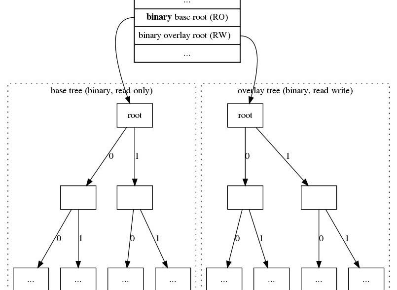 -圖4.轉換過程中,區塊擁有兩個狀態根:一個是傳統十六叉樹的只讀根,一個是覆蓋二叉樹的可讀寫根-