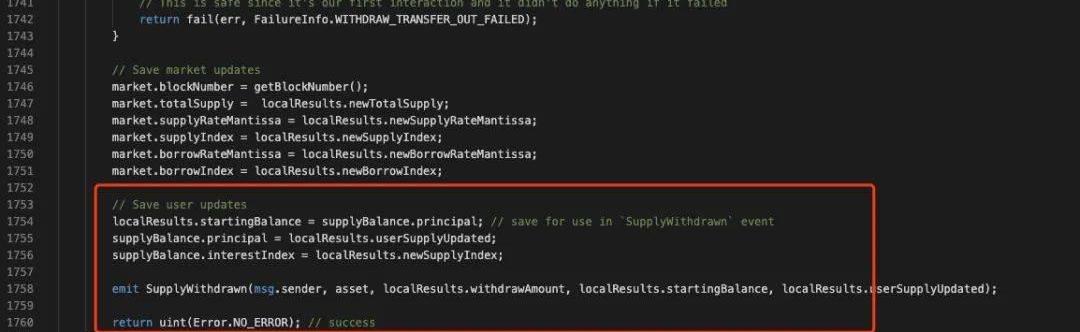 按正常的提現邏輯而言,在withdraw()單獨執行的時候,用戶的余額會被扣除并正常更新,但是由于攻擊者將withdraw()嵌入在supply()中,在withdraw()函數更新了用戶余額(supplyBalance)后,接下來在supply()函數要執行的代碼,也就是1590行之后,用戶的余額會再被更新一次,而用于更新的值會是先前supply()函數開頭的保存在localResults?中的用戶原先的存款加上攻擊者第一次調用supply()函數存款的值。